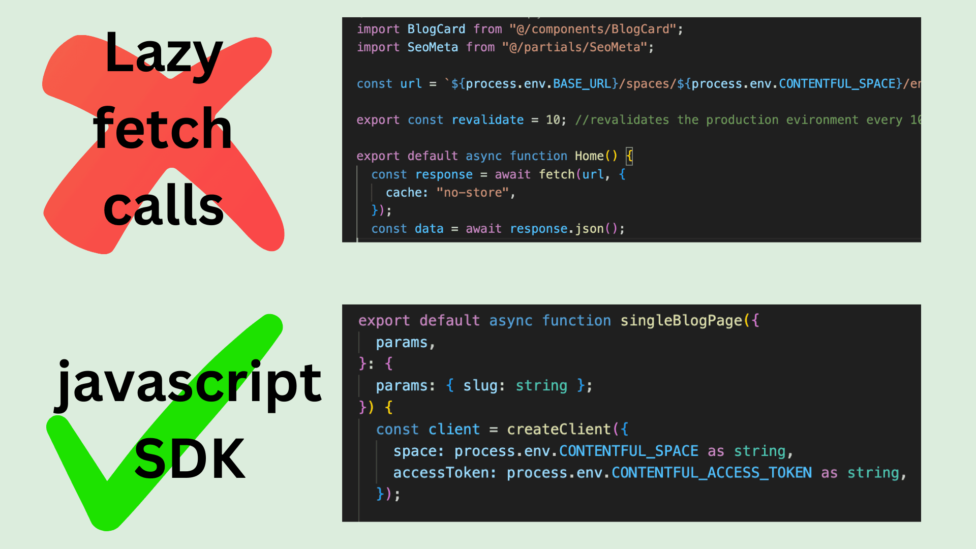 When it comes to fetching data, ditch the lazy fetch requests and opt for native JavaScript SDKs. Take Contentful, for example. Their SDK not only simplifies things but also makes responses way more reliable.
